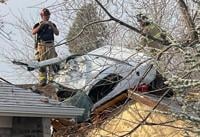 A car rests on top of a home in Nampa after a single-vehicle crash Sunday morning. According to Nampa police, the car was traveling westbound on Amity Avenue at a high rate of speed, hit a berm and went airborne. It then struck the chimney of a home before landing on the roof of another house next door. One passenger died in the crash, while the driver and another passenger were injured. No one in either home was hurt.